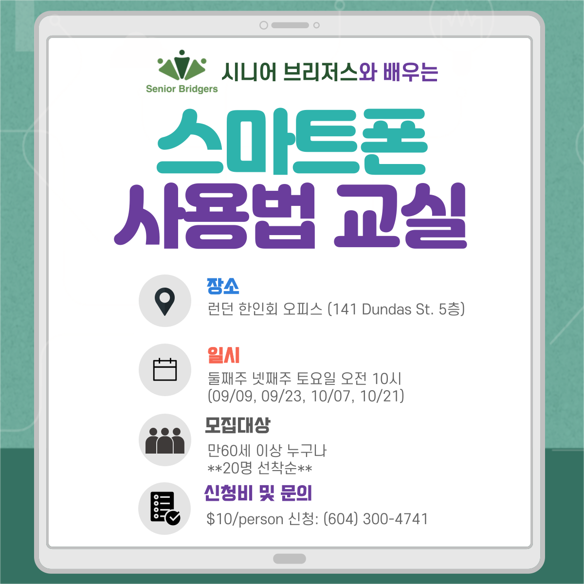지난 2월에 진행했던 시니어브리저스 스마트폰 사용법 특별 강좌때 보내주셨던 응원에 힘입어 두번째 스마트폰 사용법 교실을 열게 되었습니다!